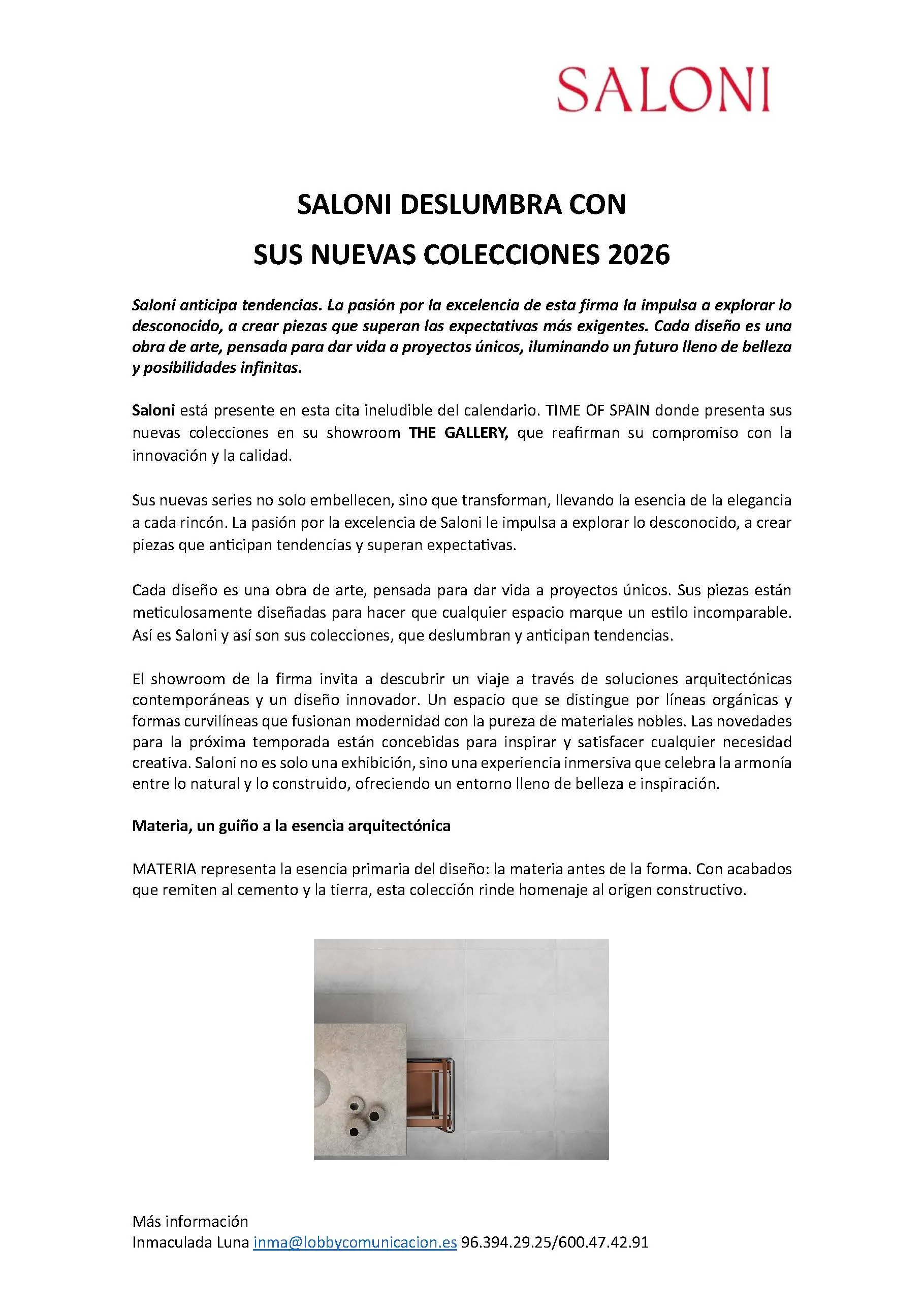 Saloni está presente en esta cita ineludible del calendario. TIME OF SPAIN donde presenta sus nuevas colecciones en su showroom THE GALLERY, que reafirman su compromiso con la innovación y la calidad.