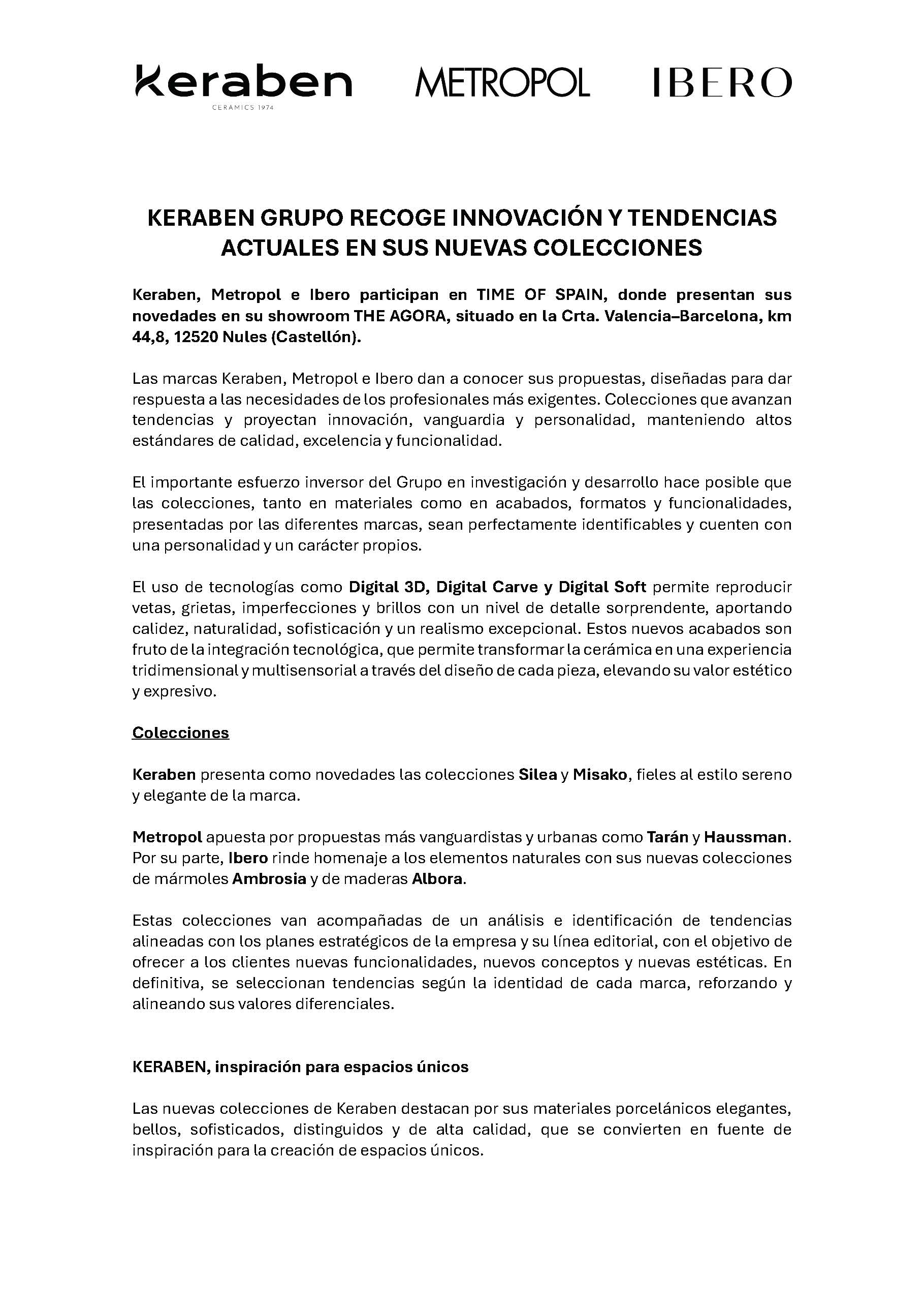 Keraben, Metropol e Ibero participan en TIME OF SPAIN, donde presentan sus novedades en su showroom THE AGORA, situado en la Crta. Valencia–Barcelona, km 44,8, 12520 Nules (Castellón).